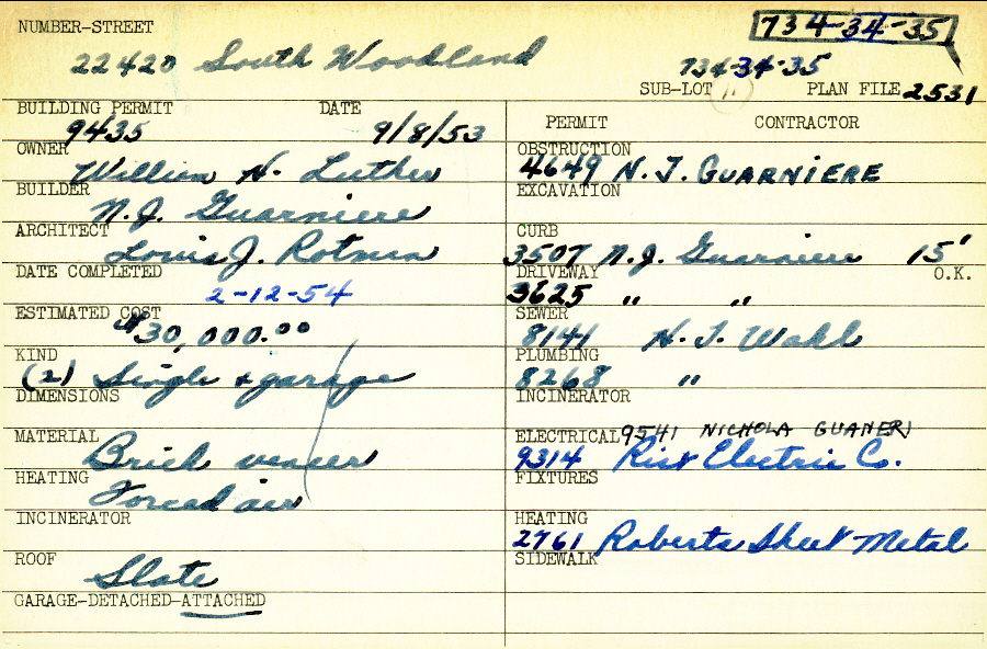22420 South Woodland Road Shaker Heights, OH 44122 PARCEL ID: 734-34-035 Building Permit Date: 09-08-1953 Plan File Number: 2531 Microfilm Roll: Roll #36 Neighborhood: Mercer Owner: Luther, William H. Builder: Guarniere, N. J. Architect: Rotman, Louis J. Estimated Cost: 30000 Date Completed: 02-12-1954 Kind: Single Dwelling and Garage (2) Material: Brick Veneer Heating: Forced Air Roof: Slate Garage: attached |