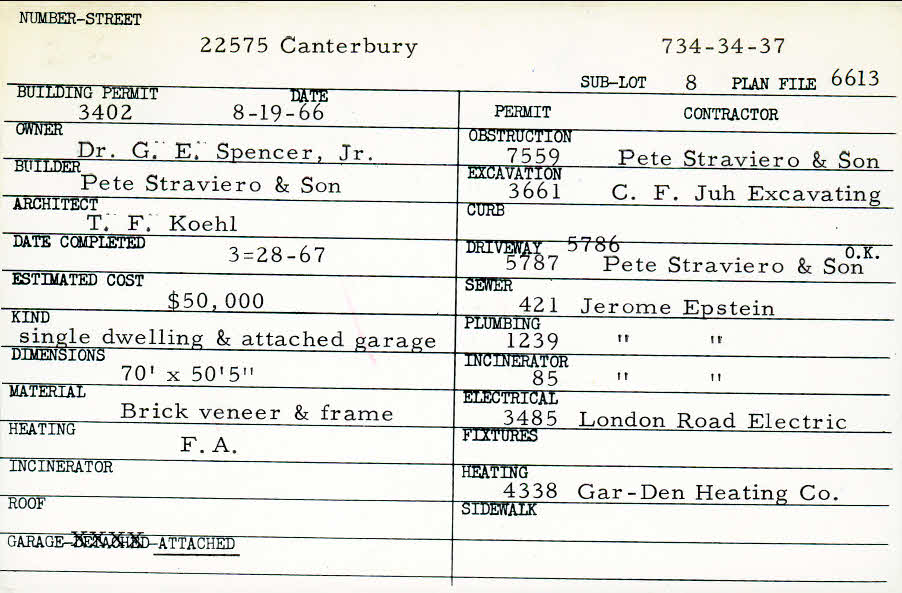 22575 Canterbury Lane Shaker Heights, OH 44122 PARCEL ID: 734-34-037 Building Permit Date: 08-19-1966 Plan File Number: 6613 Microfilm Roll: Roll#87 Neighborhood: Mercer Owner: Spencer, Dr. G. E. Jr. Builder: Pete Straviero and Son Architect: Koehl, T. F. Estimated Cost: 50000 Date Completed: 03-28-1967 Kind: Single Dwelling and Garage Material: Brick Veneer and Frame Heating: Forced Air Garage: attached |