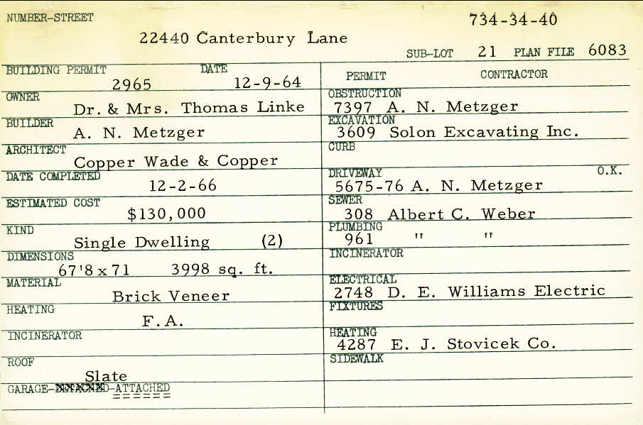 22440 Canterbury Lane Shaker Heights, OH 44122 PARCEL ID: 734-34-040 Building Permit Date: 12-09-1964 Plan File Number: 6083, 6784 Microfilm Roll: Roll#88 Neighborhood: Mercer Owner: Linke, Dr. and Mrs. Thomas Builder: Metzger, A. N. Architect: Copper, Wade and Copper Estimated Cost: 130000 Date Completed: 12-02-1966 Kind: Single, Single Residence or Dwelling (2) Material: Brick Veneer Heating: Forced Air Roof: Slate Garage: attached |