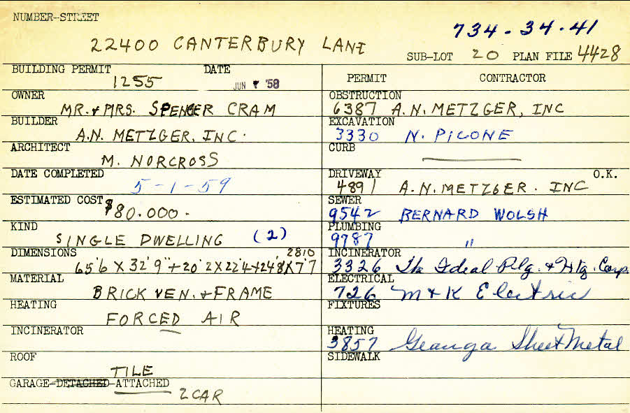 22400 Canterbury Lane Shaker Heights, OH 44122 PARCEL ID: 734-34-041 Building Permit Date: 06-07-1958 Plan File Number: 4428, 7329, 7730 Microfilm Roll: Roll#63, Roll#92, Roll#94 Neighborhood: Mercer Owner: Cram, Mr. and Mrs. Spencer Builder: A. N. Metzger Inc. Architect: Norcross, M. Estimated Cost: 80000 Date Completed: 05-01-1959 Kind: Single, Single Residence or Dwelling (2) Material: Brick Veneer and Frame Heating: Forced Air Roof: Tile Garage: attached 2 car |