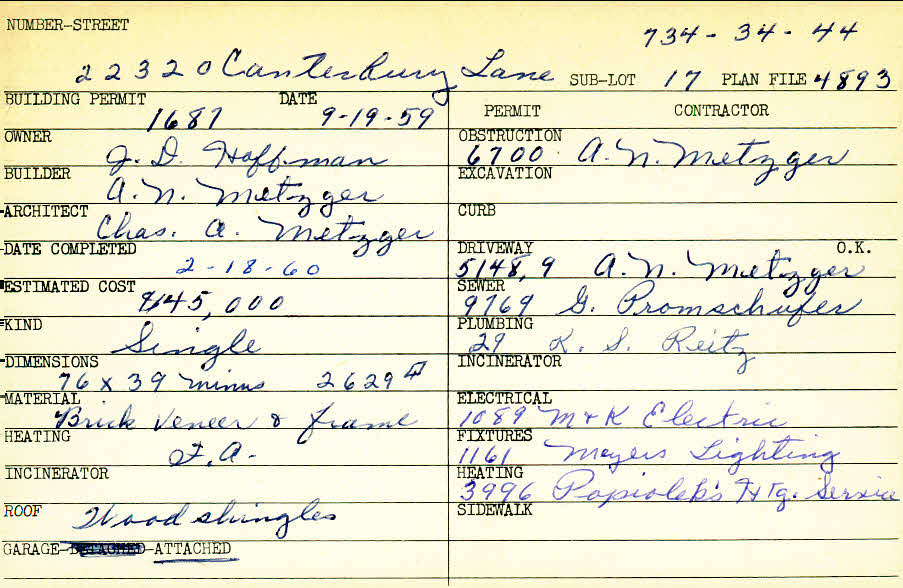 22320 Canterbury Lane Shaker Heights, OH 44122 PARCEL ID: 734-34-044 Building Permit Date: 09-19-1959 Plan File Number: 4893 Microfilm Roll: Roll#67 Neighborhood: Mercer Owner: Hoffman, J. D. Builder: Metzger, A. N. Architect: Metzger, Charles A. Estimated Cost: 45000 Date Completed: 02-18-1960 Kind: Single, Single Residence or Dwelling Material: Brick Veneer and Frame Heating: Forced Air Roof: Wood Shingle Garage: attached |