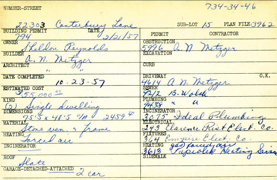 22303 Canterbury Lane Shaker Heights, OH 44122 PARCEL ID: 734-34-046 Building Permit Date: 02-21-1957 Plan File Number: 3962 Neighborhood: Mercer Owner: Reynolds, Sheldon Builder: Metzger, A. N. Architect: Metzger, A. N. Estimated Cost: 55000 Date Completed: 10-23-1957 Kind: Single, Single Residence or Dwelling (2) Material: Stone Veneer and Frame Heating: Forced Air Roof: Slate Garage: attached 2 car Card Available: yes |