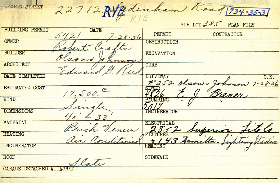 22712 Rye Road Shaker Heights, OH 44122 PARCEL ID: 734-35-003 Building Permit Date: 07-28-1936 Plan File Number: 7294 Microfilm Roll: Roll#92 Neighborhood: Mercer Owner: Crafts, Robert Builder: Olson and Johnson Architect: Reed, Edward G. Estimated Cost: 17500 Kind: Single, Single Residence or Dwelling Material: Brick Veneer Heating: Air Conditioned Roof: Slate |