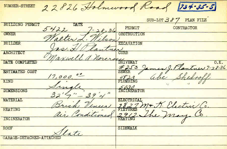 22826 Holmwood Road Shaker Heights, OH 44122 PARCEL ID: 734-35-005 Building Permit Date: 07-28-1936 Plan File Number: 5684, 10095 Microfilm Roll: Roll#77, Roll#106 Neighborhood: Mercer Owner: Wilson, Walter L. Builder: Plantner, James H. Architect: Norcross, Maxwell A. Estimated Cost: 17000 Kind: Single, Single Residence or Dwelling Material: Brick Veneer Heating: Air Conditioned Roof: Slate |