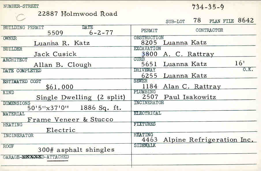22887 Holmwood Road Shaker Heights, OH 44122 PARCEL ID: 734-35-009 Building Permit Date: 06-02-1977 Plan File Number: 8642 Microfilm Roll: Roll#98 Neighborhood: Mercer Owner: Katz, Luanna R. Builder: Cusick, Jack Architect: Clough, Allan B. Estimated Cost: 61000 Kind: Single, Single Residence or Dwelling (2) Material: Frame Veneer and Stucco Roof: 300# Min Asphalt Garage: attached |