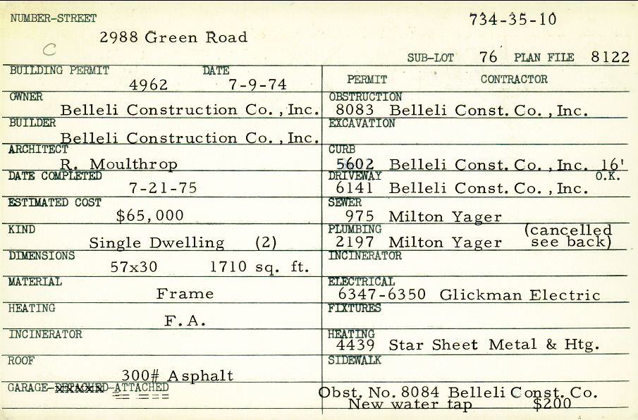 2988 Green Road Shaker Heights, OH 44122 PARCEL ID: 734-35-010 Building Permit Date: 07-09-1974 Plan File Number: 8122, 10103 Microfilm Roll: Roll#97, Roll#99, NewRoll#2 Neighborhood: Mercer Owner: Belleli Construction Company, Inc. Builder: Belleli Construction Company, Inc. Architect: Moulthrop, R. Estimated Cost: 65000 Date Completed: 07-21-1975 Kind: Single, Single Residence or Dwelling (2) Material: Frame Heating: Forced Air Roof: 300# Min Asphalt Garage: attached |
