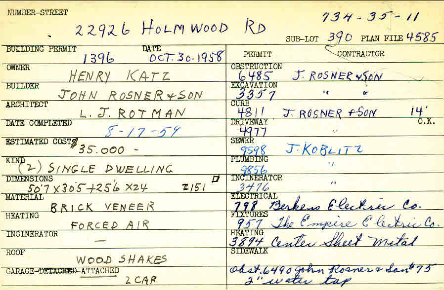 22926 Holmwood Road Shaker Heights, OH 44122 PARCEL ID: 734-35-011 Building Permit Date: 10-30-1958 Plan File Number: 4585 Microfilm Roll: Roll#64 Neighborhood: Mercer Owner: Katz, Henry Builder: John Rosner and Son Architect: Rotman, L. J. Estimated Cost: 35000 Date Completed: 08-17-1959 Kind: Single, Single Residence or Dwelling (2) Material: Brick Veneer Heating: Forced Air Roof: Wood Shakes Garage: attached 2 car |