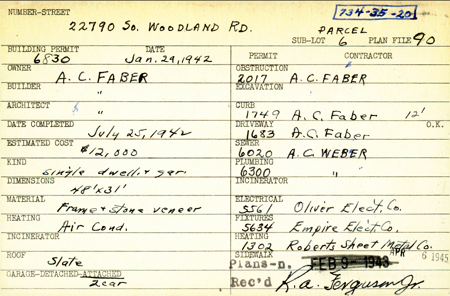 22790 South Woodland Road Shaker Heights, OH 44122 PARCEL ID: 734-35-020 Building Permit Date: 01-29-1942 Plan File Number: 90 Neighborhood: Mercer Owner: Faber, A. C. Builder: Faber, A. C. Architect: Faber, A. C. Estimated Cost: 12000 Date Completed: 07-25-1942 Kind: Single Dwelling and Garage Material: Frame and Stone Veneer Heating: Air Conditioned Roof: Slate Garage: attached 2 car Card Available: yes |