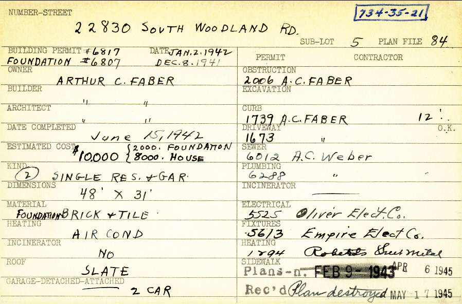 22830 South Woodland Road Shaker Heights, OH 44122 PARCEL ID: 734-35-021 Building Permit Date: 12-08-1941 Plan File Number: 84, 3632, 6536, 6576 Microfilm Roll: Roll#54, Roll#86 Neighborhood: Mercer Owner: Faber, Arthur C. Builder: Faber, Arthur C. Architect: Faber, Arthur C. Estimated Cost: 10000 Date Completed: 06-15-1942 Kind: Single Dwelling and Garage (2) Material: Brick and Tile Heating: Air Conditioned Roof: Slate Garage: attached 2 car |