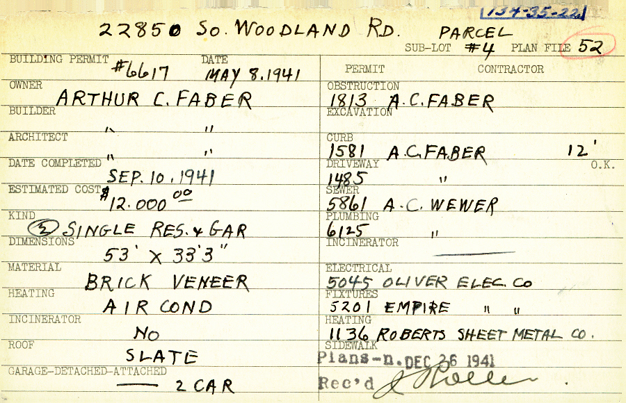 22850 South Woodland Road Shaker Heights, OH 44122 PARCEL ID: 734-35-022 Building Permit Date: 05-08-1941 Plan File Number: 52 Neighborhood: Mercer Owner: Faber, Arthur C. Builder: Faber, Arthur C. Architect: Faber, Arthur C. Estimated Cost: 12000 Date Completed: 09-10-1941 Kind: Single Dwelling and Garage (2) Material: Brick Veneer Heating: Air Conditioned Roof: Slate Garage: attached 2 car Card Available: yes |