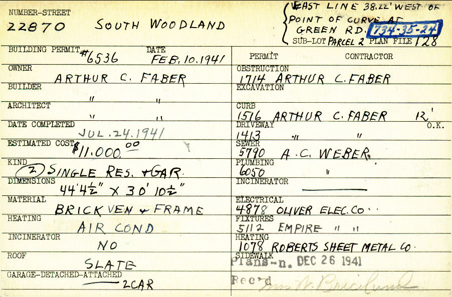 22870 South Woodland Road Shaker Heights, OH 44122 PARCEL ID: 734-35-024 Building Permit Date: 02-10-1941 Plan File Number: 128, 11650 Microfilm Roll: NewRoll#8 Neighborhood: Mercer Owner: Faber, Arthur C. Builder: Faber, Arthur C. Architect: Faber, Arthur C. Estimated Cost: 11000 Date Completed: 07-24-1941 Kind: Single Dwelling and Garage (2) Material: Brick Veneer and Frame Heating: Air Conditioned Roof: Slate Garage: attached 2 car |
