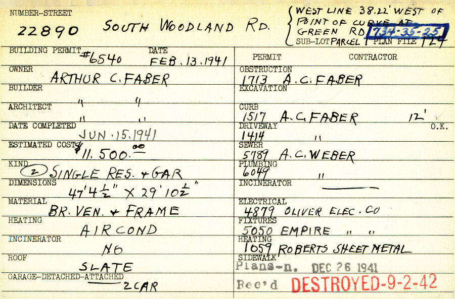 22890 South Woodland Road Shaker Heights, OH 44122 PARCEL ID: 734-35-025 Building Permit Date: 02-13-1941 Plan File Number: 124 Neighborhood: Mercer Owner: Faber, Arthur C. Builder: Faber, Arthur C. Architect: Faber, Arthur C. Estimated Cost: 11500 Date Completed: 06-15-1941 Kind: Single Dwelling and Garage (2) Material: Brick Veneer and Frame Heating: Air Conditioned Roof: Slate Garage: attached 2 car Card Available: yes |