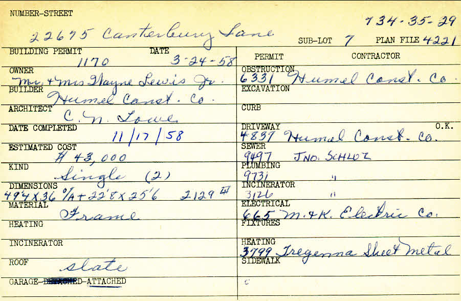 22675 Canterbury Lane Shaker Heights, OH 44122 PARCEL ID: 734-35-029 Building Permit Date: 03-24-1958 Plan File Number: 4221 Microfilm Roll: Roll#61 Neighborhood: Mercer Owner: Lewis, Mr. and Mrs. Wayne Jr. Builder: Humel Construction Company Architect: Lowe, C. N. Estimated Cost: 43000 Date Completed: 11-17-1958 Kind: Single, Single Residence or Dwelling (2) Material: Frame Roof: Slate Garage: attached |