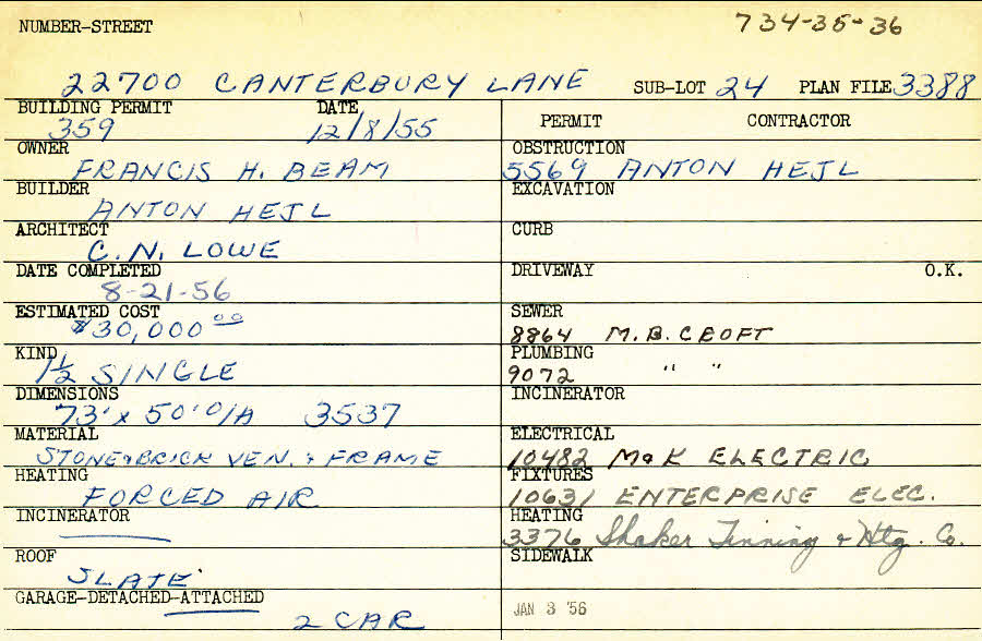 22700 Canterbury Lane Shaker Heights, OH 44122 PARCEL ID: 734-35-036 Building Permit Date: 12-08-1955 Plan File Number: 3388 Microfilm Roll: Roll#49 Neighborhood: Mercer Owner: Beam, Francis H. Builder: Hejl, Anton Architect: Lowe, C. N. Estimated Cost: 30000 Date Completed: 08-21-1956 Kind: Single, Single Residence or Dwelling Material: Stone and Brick Veneer and Frame Heating: Forced Air Roof: Slate Garage: attached 2 car |