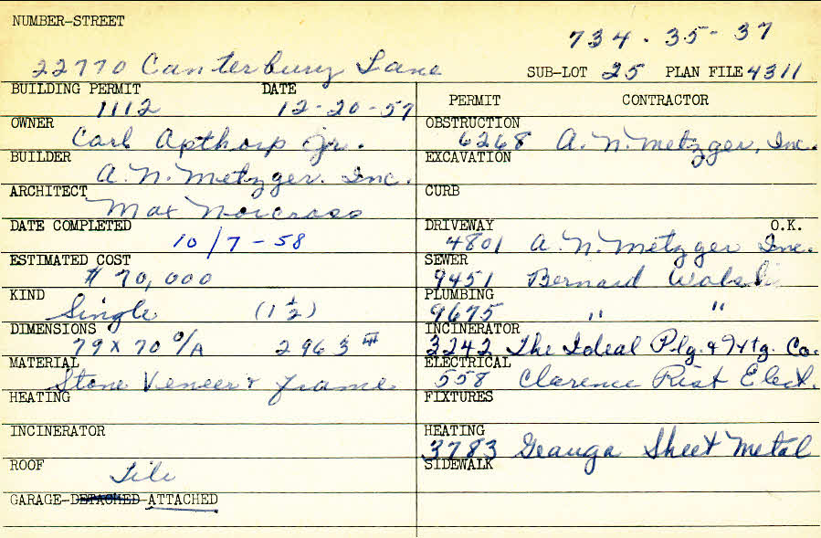 22770 Canterbury Lane Shaker Heights, OH 44122 PARCEL ID: 734-35-037 Building Permit Date: 12-20-1957 Plan File Number: 4311 scanned, 7908, 7923 Microfilm Roll: Roll062, Roll#95 Neighborhood: Mercer Owner: Apthorp, Carl Jr. Builder: A. N. Metzger Inc. Architect: Norcross, Max Estimated Cost: 70000 Date Completed: 10-07-1958 Kind: Single, Single Residence or Dwelling Material: Stone Veneer and Frame Roof: Tile Garage: attached |