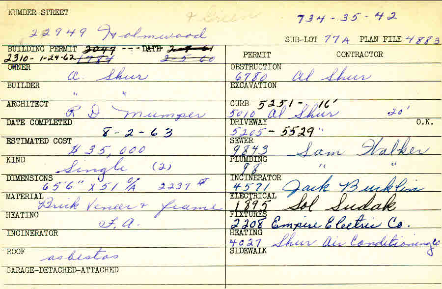 22949 Holmwood Road Shaker Heights, OH 44122 PARCEL ID: 734-35-042 Building Permit Date: 01-24-1962 Plan File Number: 4883, 4495 Microfilm Roll: Roll#67, Roll#63 Neighborhood: Mercer Owner: Shur, A. Builder: Shur, A. Architect: Mumper, R. D. Estimated Cost: 35000 Date Completed: 08-02-1963 Kind: Single, Single Residence or Dwelling (2) Material: Brick Veneer and Frame Heating: Forced Air Roof: Asbestos |