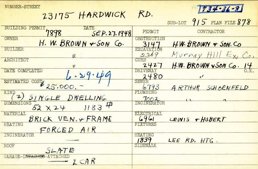 23175 Hardwick Road Shaker Heights, OH 44122 PARCEL ID: 734-36-008 Building Permit Date: 09-27-1948 Plan File Number: 878 scanned, 9533, 10727 Microfilm Roll: Roll011, Roll#103, NewRoll#5 Neighborhood: Mercer Owner: H. W. Brown and Son Company Builder: H. W. Brown and Son Company Architect: H. W. Brown and Son Company Estimated Cost: 25000 Date Completed: 06-29-1949 Kind: Single, Single Residence or Dwelling (2) Material: Brick Veneer and Frame Heating: Forced Air Roof: Slate Garage: attached 2 car |