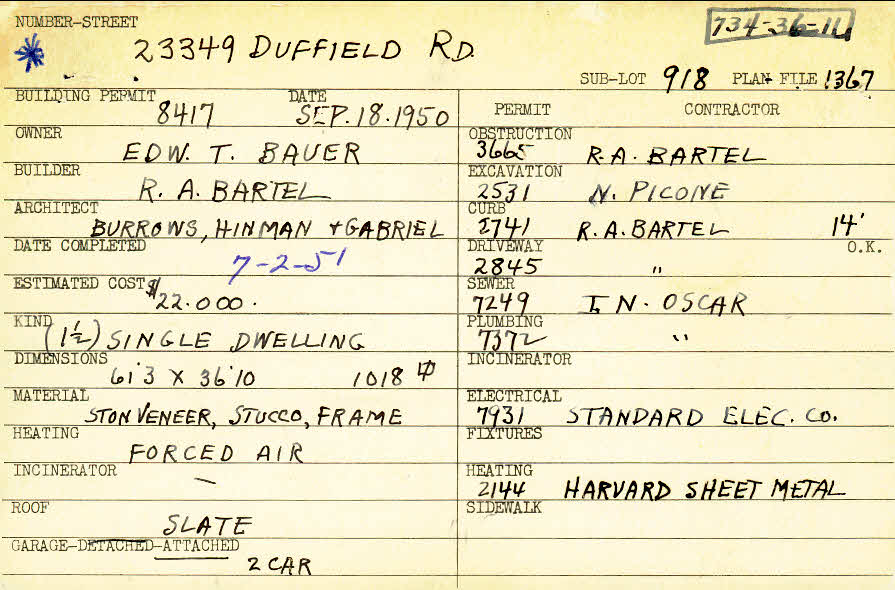 23349 Duffield Road Shaker Heights, OH 44122 PARCEL ID: 734-36-011 Building Permit Date: 09-18-1950 Plan File Number: 1367 all scanned Microfilm Roll: Roll016 Neighborhood: Mercer Owner: Bauer, Edward T. Builder: Bartel, R. A. Architect: Burrows, Hinman and Gabriel Estimated Cost: 22000 Date Completed: 07-02-1951 Kind: Single 1-1/2 Material: Stone Veneer, Stucco, Frame Heating: Forced Air Roof: Slate Garage: attached 2 car Card Available: Yes |