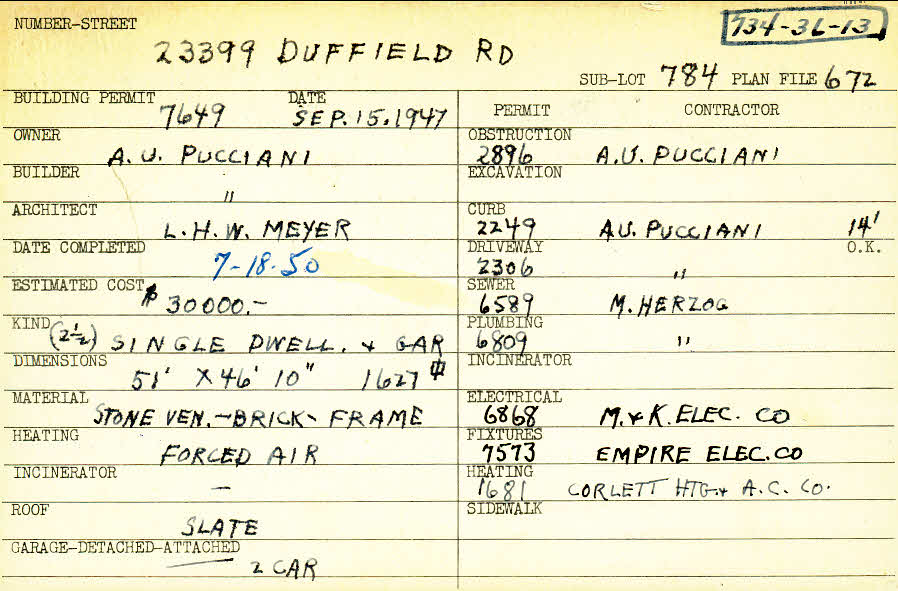 23399 Duffield Road Shaker Heights, OH 44122 PARCEL ID: 734-36-013 Building Permit Date: 09-15-1947 Plan File Number: 672 scanned, 7892 Microfilm Roll: Roll008, Roll#95 Neighborhood: Mercer Owner: Pucciani, A. U. Builder: Pucciani, A. U. Architect: Meyer, L. H. W. Estimated Cost: 30000 Date Completed: 07-18-1950 Kind: Single 2-1/2 Material: Stone Veneer, Brick and Frame Heating: Forced Air Roof: Slate Garage: attached 2 car |
