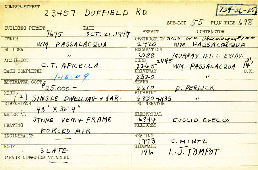 23457 Duffield Road Shaker Heights, OH 44122 PARCEL ID: 734-36-015 Building Permit Date: 10-21-1947 Plan File Number: 698 scanned, 4537 Microfilm Roll: Roll008, Roll#63 Neighborhood: Mercer Owner: Passalacqua, William Builder: Passalacqua, William Architect: Apicella, C. T. Estimated Cost: 25000 Date Completed: 01-15-1949 Kind: Single Dwelling and Garage (2) Material: Stone Veneer and Frame Heating: Forced Air Roof: Slate Garage: attached |