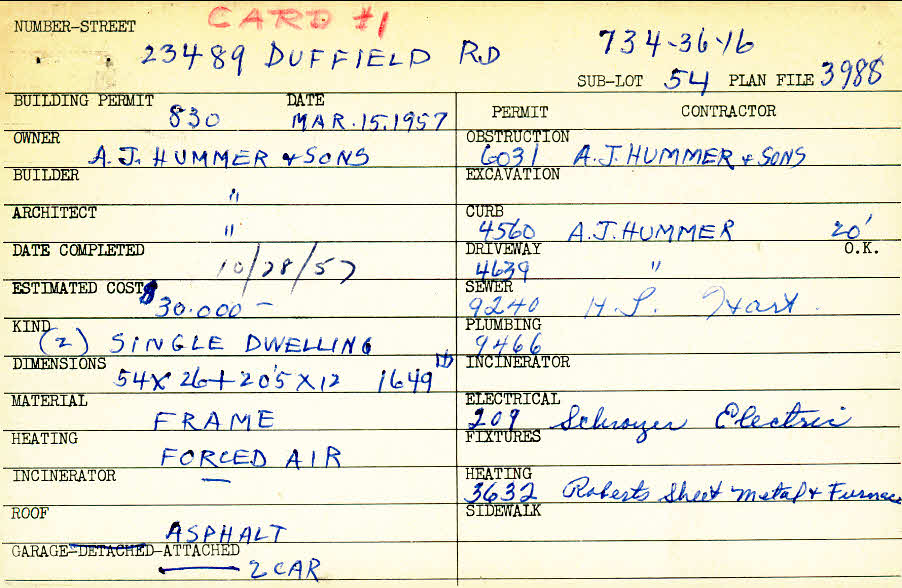 23489 Duffield Road Shaker Heights, OH 44122 PARCEL ID: 734-36-016 Building Permit Date: 03-15-1957 Plan File Number: 3988, 9202 Microfilm Roll: Roll#58, Roll#102 Neighborhood: Mercer Owner: A. J. Hummer and Sons Builder: A. J. Hummer and Sons Architect: A. J. Hummer and Sons Estimated Cost: 30000 Date Completed: 10-28-1957 Kind: Single, Single Residence or Dwelling (2) Material: Frame Heating: Forced Air Roof: Asphalt Garage: attached 2 car |