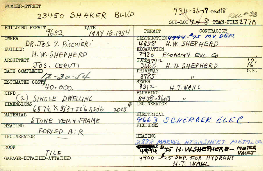23450 Shaker Boulevard Shaker Heights, OH 44122 PARCEL ID: 734-36-019 Building Permit Date: 05-18-1954 Plan File Number: 2770 Microfilm Roll: Roll #38 Neighborhood: Mercer Owner: Pischieri, Dr. Joseph V. Builder: Shepherd, H. W. Architect: Ceruti, Joseph Estimated Cost: 40000 Date Completed: 12-30-1954 Kind: Single, Single Residence or Dwelling (2) Material: Stone Veneer and Frame Heating: Forced Air Roof: Tile |