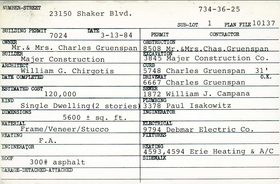 23150 Shaker Boulevard Shaker Heights, OH 44122 PARCEL ID: 734-36-025 Building Permit Date: 03-13-1984 Plan File Number: 10137*, 11584 Microfilm Roll: NewRoll#2, NewRoll#8 Neighborhood: Mercer Owner: Gruenspan, Mr. and Mrs. Charles Builder: Majer Construction Architect: Chirgotis, William G. Estimated Cost: 120000 Kind: Single, Single Residence or Dwelling (2) Material: Frame / Veneer / Stucco Heating: Forced Air Roof: Asphalt |