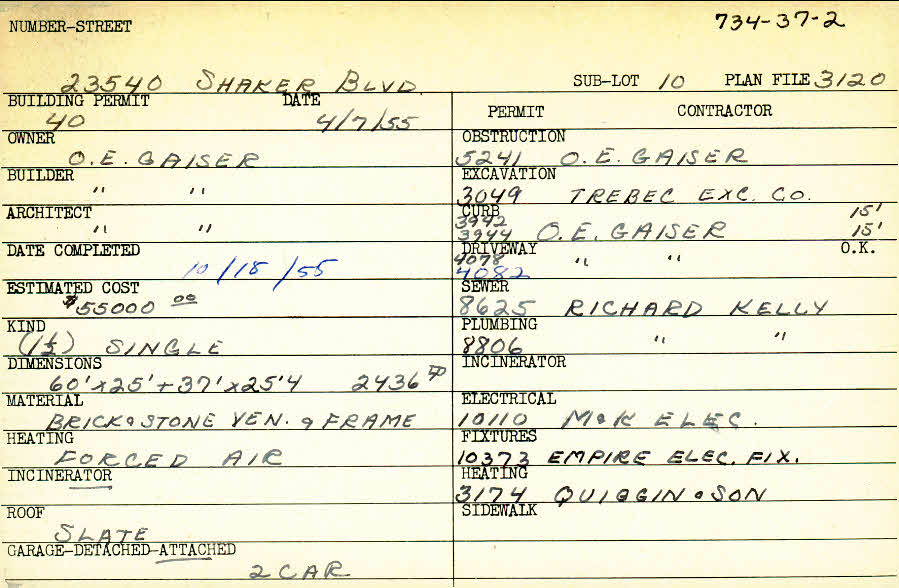 23540 Shaker Boulevard Shaker Heights, OH 44122 PARCEL ID: 734-37-002 Building Permit Date: 04-07-1955 Plan File Number: 3120 Microfilm Roll: Roll#43 Neighborhood: Mercer Owner: Gaiser, O. E. Builder: Gaiser, O. E. Architect: Gaiser, O. E. Estimated Cost: 55000 Date Completed: 10-18-1955 Kind: Single, Single Residence or Dwelling Material: Brick and Stone Veneer and Frame Heating: Forced Air Roof: Slate Garage: attached 2 car |