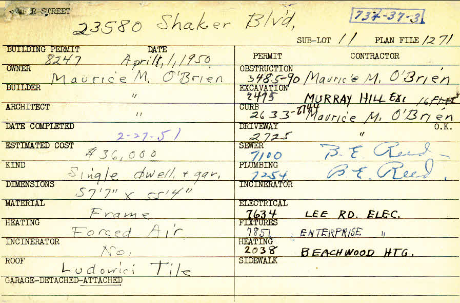 23580 Shaker Boulevard Shaker Heights, OH 44122 PARCEL ID: 734-37-003 Building Permit Date: 04-01-1950 Plan File Number: 1271 Microfilm Roll: Roll#15 Neighborhood: Mercer Owner: O'Brien, Maurice M. Builder: O'Brien, Maurice M. Architect: O'Brien, Maurice M. Estimated Cost: 36000 Date Completed: 02-27-1951 Kind: Single Dwelling and Garage Material: Frame Heating: Forced Air Roof: Tile Garage: attached |