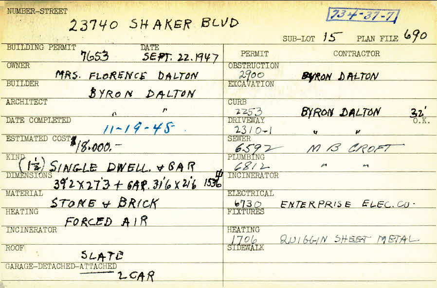 23740 Shaker Boulevard Shaker Heights, OH 44122 PARCEL ID: 734-37-007 Building Permit Date: 09-22-1947 Plan File Number: 690 scanned, 2762 Microfilm Roll: Roll008, Roll #38 Owner: Dalton, Mrs. Florence Builder: Dalton, Byron Architect: Dalton, Byron Estimated Cost: 18000 Date Completed: 11-19-1948 Kind: Single Dwelling and Garage Material: Stone and Brick Heating: Forced Air Roof: Slate Garage: attached 2 car |
