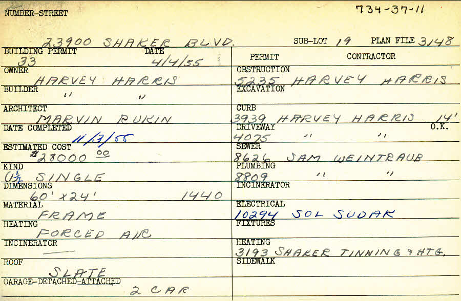 23900 Shaker Boulevard Shaker Heights, OH 44122 PARCEL ID: 734-37-011 Building Permit Date: 04-04-1955 Plan File Number: 3148 Microfilm Roll: Roll#44 Neighborhood: Mercer Owner: Harris, Harvey Builder: Harris, Harvey Architect: Rukin, Marvin Estimated Cost: 28000 Date Completed: 11-03-1955 Kind: Single, Single Residence or Dwelling Material: Frame Heating: Forced Air Roof: Slate Garage: attached 2 car |