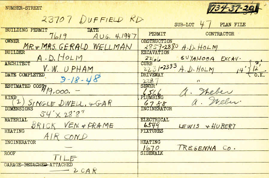 23707 Duffield Road Shaker Heights, OH 44122 PARCEL ID: 734-37-020 Building Permit Date: 08-04-1947 Plan File Number: 595 all scanned Microfilm Roll: Roll007 Neighborhood: Mercer Owner: Wellman, Mr. and Mrs. Gerald Builder: Holm, A. D. Architect: Upham, V. W. Estimated Cost: 19000 Date Completed: 03-18-1948 Kind: Single Dwelling and Garage (2) Material: Brick Veneer and Frame Heating: Air Conditioned Roof: Tile Garage: attached 2 car |