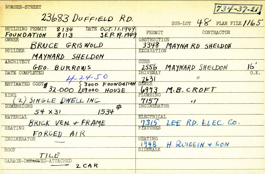 23683 Duffield Road Shaker Heights, OH 44122 PARCEL ID: 734-37-021 Building Permit Date: 09-19-1949 Plan File Number: 1165 scanned, 4693, 11164 Microfilm Roll: Roll014, Roll#65, NewRoll#7 Neighborhood: Mercer Owner: Griswold, Bruce Builder: Sheldon, Maynard Architect: Burrows, George Estimated Cost: 32000 Date Completed: 04-24-1950 Kind: Single, Single Residence or Dwelling (2) Material: Brick Veneer and Frame Heating: Forced Air Roof: Tile Garage: attached 2 car |