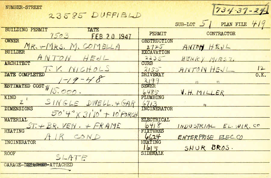23585 Duffield Road Shaker Heights, OH 44122 PARCEL ID: 734-37-024 Building Permit Date: 02-20-1947 Plan File Number: 419 all scanned Microfilm Roll: Roll004 Neighborhood: Mercer Owner: Comella, Mr. and Mrs. M. Builder: Hejl, Anton Architect: Nichols, T. V. Estimated Cost: 15000 Date Completed: 01-19-1948 Kind: Single, Single Residence or Dwelling (2) Material: Stone and Brick Veneer and Frame Heating: Air Conditioned Roof: Slate Garage: attached |