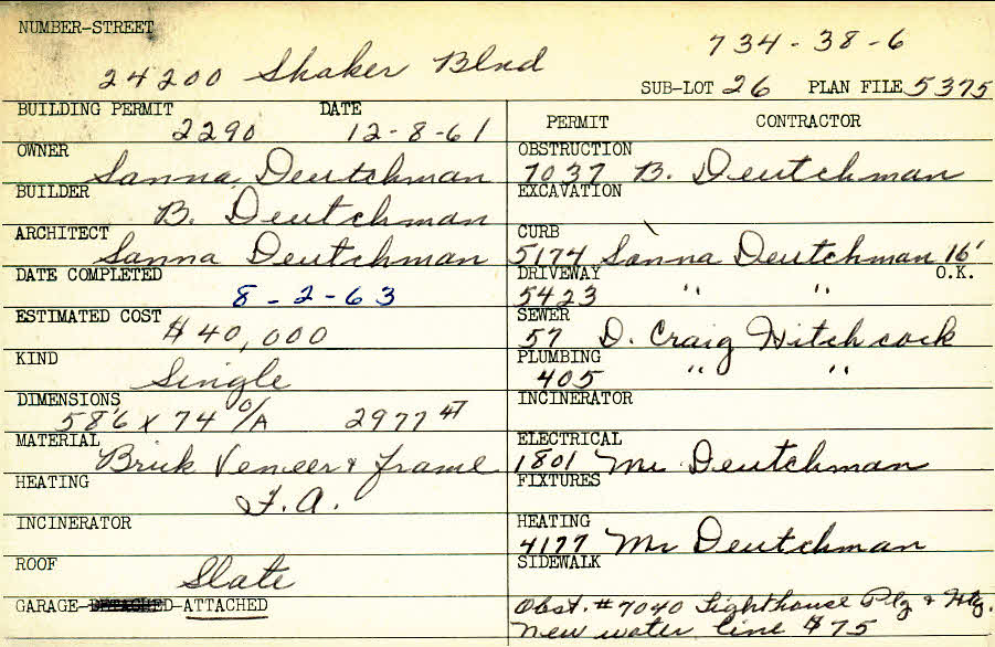 24200 Shaker Boulevard Shaker Heights, OH 44122 PARCEL ID: 734-38-006 Building Permit Date: 12-08-1961 Plan File Number: 5375 Microfilm Roll: Roll#73 Neighborhood: Mercer Owner: Deutchman, Sanna Builder: Deutchman, B. Architect: Deutchman, Sanna Estimated Cost: 40000 Date Completed: 08-02-1963 Kind: Single, Single Residence or Dwelling Material: Brick Veneer and Frame Heating: Forced Air Roof: Slate Garage: attached |