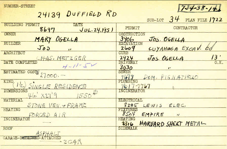 24139 Duffield Road Shaker Heights, OH 44122 PARCEL ID: 734-38-014 Building Permit Date: 07-24-1951 Plan File Number: 1722 scanned, 11437 Microfilm Roll: Roll026, NewRoll#7 Neighborhood: Mercer Owner: Ogella, Mary Builder: Ogella, Joseph Architect: Metzger, Charles A. Estimated Cost: 27000 Date Completed: 04-11-1952 Kind: Single, Single Residence or Dwelling Material: Stone Veneer and Frame Heating: Forced Air Roof: Asphalt Garage: attached 2 car |