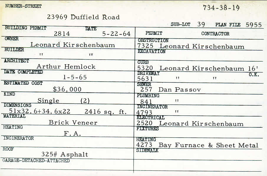 23969 Duffield Road Shaker Heights, OH 44122 PARCEL ID: 734-38-019 Building Permit Date: 05-22-1964 Plan File Number: 5955 Microfilm Roll: Roll#80 Neighborhood: Mercer Owner: Kirschenbaum, Leonard Builder: Kirschenbaum, Leonard Architect: Hemlock, Arthur Estimated Cost: 36000 Date Completed: 01-05-1965 Kind: Single, Single Residence or Dwelling (2) Material: Brick Veneer Heating: Forced Air Roof: Asphalt |