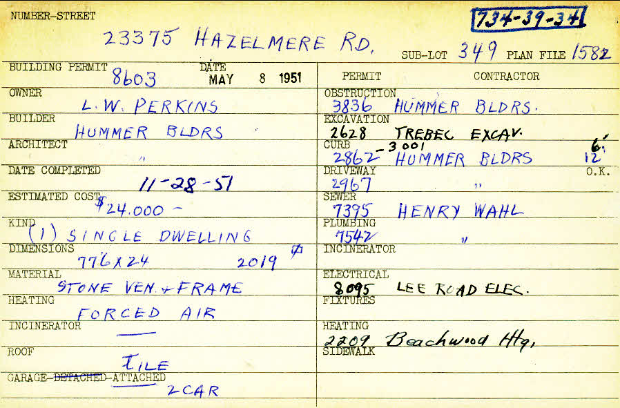 23375 Hazelmere Road Shaker Heights, OH 44122 PARCEL ID: 734-39-034 Building Permit Date: 05-08-1951 Plan File Number: 1582, 2865 all scanned Microfilm Roll: Roll025, Roll041 Neighborhood: Mercer Owner: Perkins, L. W. Builder: Hummer Builders Architect: Hummer Builders Estimated Cost: 24000 Date Completed: 11-28-1951 Kind: Single, Single Residence or Dwelling Material: Stone Veneer and Frame Heating: Forced Air Roof: Tile Garage: attached 2 car |