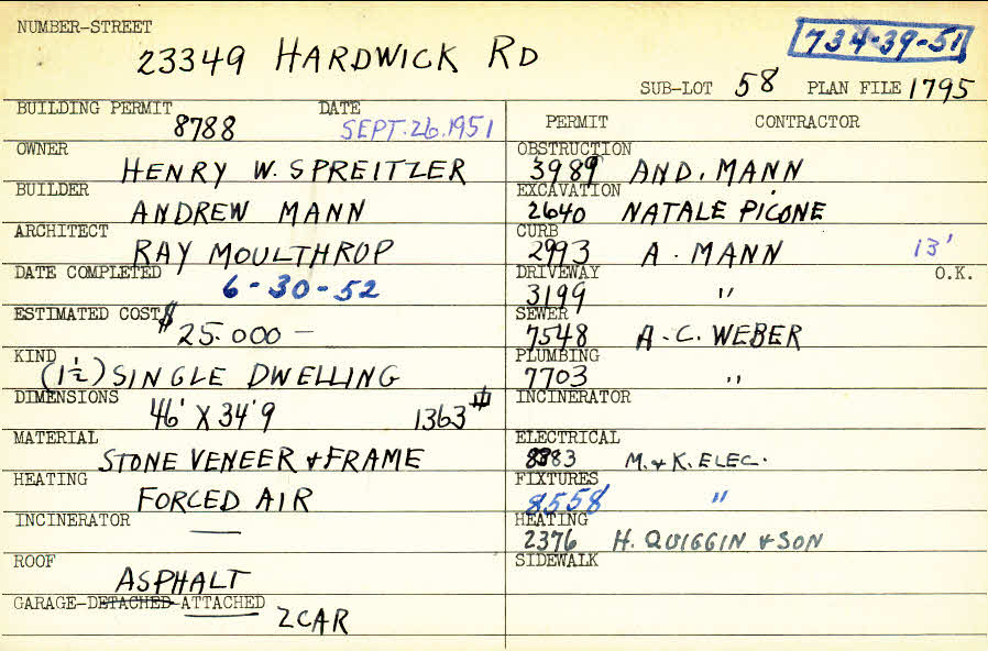 23349 Hardwick Road Shaker Heights, OH 44122 PARCEL ID: 734-39-051 Building Permit Date: 09-26-1951 Plan File Number: 1795 all scanned Microfilm Roll: Roll027 Neighborhood: Mercer Owner: Spreitzer, Henry W. Builder: Mann, Andrew Architect: Moulthrop, Ray Estimated Cost: 25000 Date Completed: 06-30-1952 Kind: Single, Single Residence or Dwelling Material: Stone Veneer and Frame Heating: Forced Air Roof: Asphalt Garage: attached 2 car |