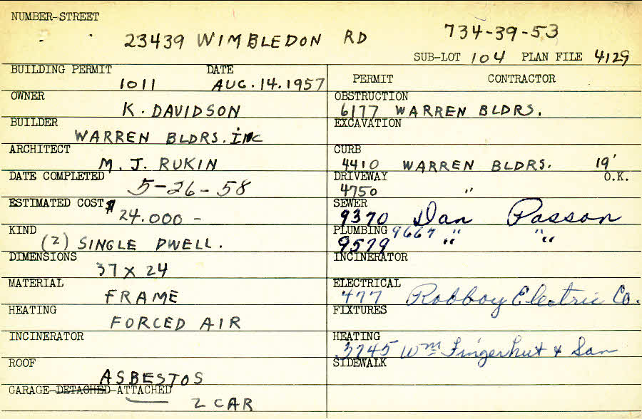 23439 Wimbledon Road Shaker Heights, OH 44122 PARCEL ID: 734-39-053 Building Permit Date: 08-14-1957 Plan File Number: 2240, 4129, 3875 Microfilm Roll: Roll#33, Roll#56, Roll#61 Neighborhood: Mercer Owner: Davidson, K. Builder: Warren Builders Inc. Architect: Rukin, M. J. Estimated Cost: 24000 Date Completed: 05-26-1958 Kind: Single, Single Residence or Dwelling (2) Material: Frame Heating: Forced Air Roof: Asbestos Garage: attached 2 car |