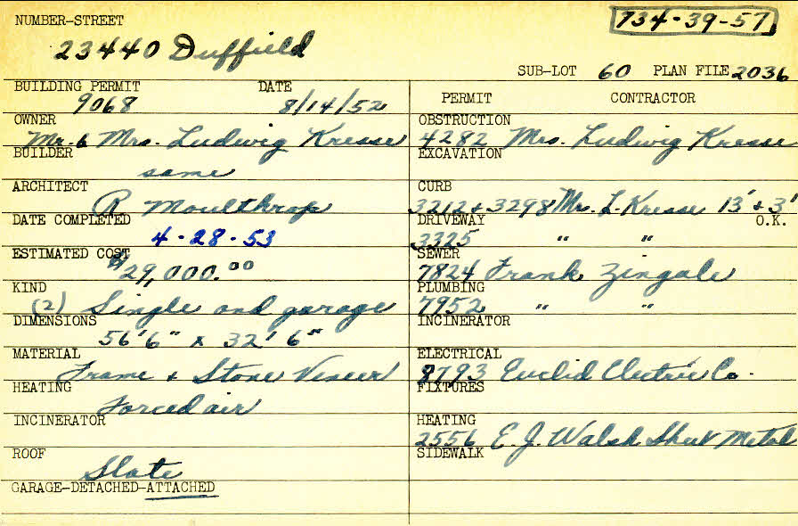 23440 Duffield Road Shaker Heights, OH 44122 PARCEL ID: 734-39-057 Building Permit Date: 08-14-1952 Plan File Number: 2036 Neighborhood: Mercer Owner: Kresser, Mr. and Mrs. Ludwig Builder: Kresser, Mr. and Mrs. Ludwig Architect: Moulthrop, R. Estimated Cost: 29000 Date Completed: 04-28-1953 Kind: Single Dwelling and Garage (2) Material: Frame and Stone Veneer Heating: Forced Air Roof: Slate Garage: attached Card Available: yes |