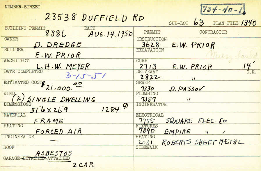 23538 Duffield Road Shaker Heights, OH 44122 PARCEL ID: 734-40-001 Building Permit Date: 08-14-1950 Plan File Number: 1340 scanned, 2095, 4587 Microfilm Roll: Roll015, Roll#32, Roll#64 Neighborhood: Mercer Owner: Dredge, D. Builder: Prior, E. W. Architect: Meyer, L. H. W. Estimated Cost: 21000 Date Completed: 03-15-1951 Kind: Single, Single Residence or Dwelling (2) Material: Frame Heating: Forced Air Roof: Asbestos Garage: attached 2 car |