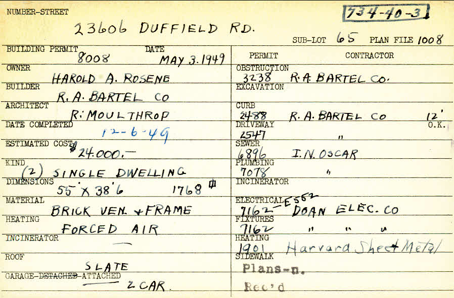 23606 Duffield Road Shaker Heights, OH 44122 PARCEL ID: 734-40-003 Building Permit Date: 05-03-1949 Plan File Number: 1008 scanned, 6881 Microfilm Roll: Roll012, Roll#89 Neighborhood: Mercer Owner: Rosene, Harold A. Builder: R. A. Bartel Company Architect: Moulthrop, R. Estimated Cost: 24000 Date Completed: 12-06-1949 Kind: Single, Single Residence or Dwelling (2) Material: Brick Veneer and Frame Heating: Forced Air Roof: Slate Garage: attached 2 car |