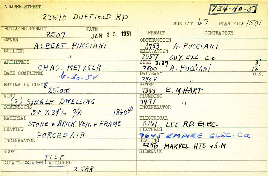 23670 Duffield Road Shaker Heights, OH 44122 PARCEL ID: 734-40-005 Building Permit Date: 01-25-1951 Plan File Number: 1501 all scanned Microfilm Roll: Roll024 Neighborhood: Mercer Owner: Pucciani, Albert Builder: Pucciani, Albert Architect: Metzger, Charles A. Estimated Cost: 25000 Date Completed: 06-30-1952 Kind: Single, Single Residence or Dwelling (2) Material: Stone and Brick Veneer and Frame Heating: Forced Air Roof: Tile Garage: attached 2 car |