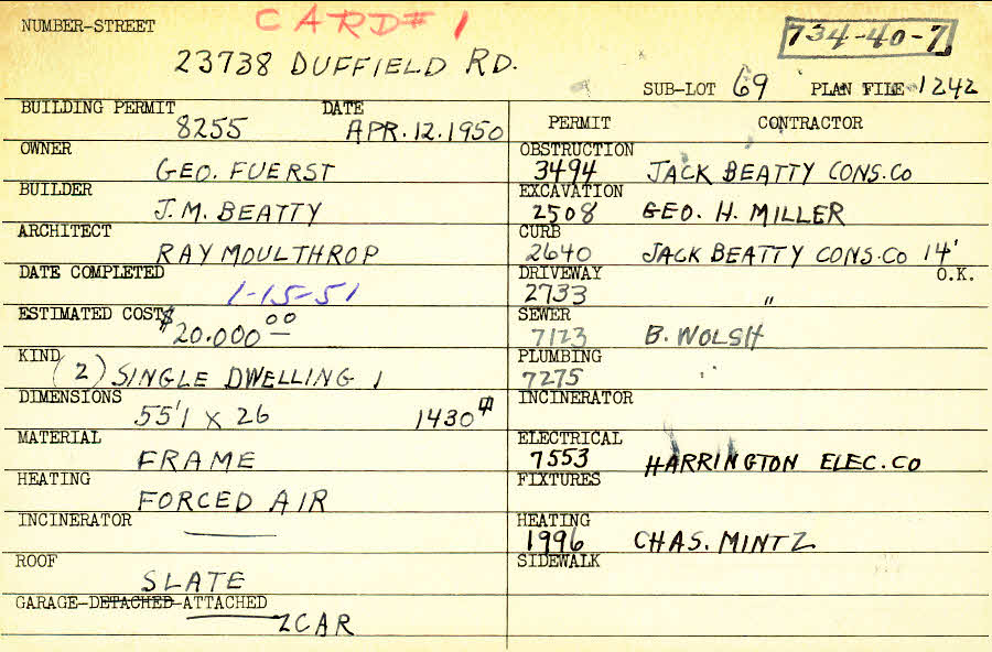 23738 Duffield Road Shaker Heights, OH 44122 PARCEL ID: 734-40-007 Building Permit Date: 04-12-1950 Plan File Number: 1242, 2509 all scanned Microfilm Roll: Roll015, Roll035 Neighborhood: Mercer Owner: Fuerst, George Builder: Beatty, J. M. Architect: Moulthrop, Ray Estimated Cost: 20000 Date Completed: 01-15-1951 Kind: Single, Single Residence or Dwelling (2) Material: Frame Heating: Forced Air Roof: Slate Garage: attached 2 car |