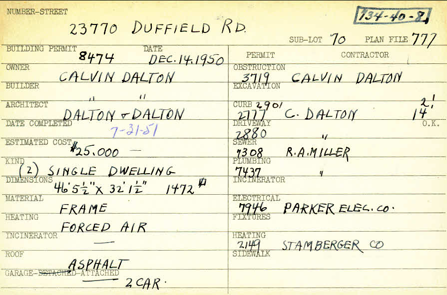 23770 Duffield Road Shaker Heights, OH 44122 PARCEL ID: 734-40-008 Building Permit Date: 12-14-1950 Plan File Number: 777 scanned, 2198, 13062 scanned Microfilm Roll: Roll011, Roll#33, NewRoll19 Neighborhood: Mercer Owner: Dalton, Calvin Builder: Dalton, Calvin Architect: Dalton and Dalton Estimated Cost: 25000 Date Completed: 07-31-1951 Kind: Single, Single Residence or Dwelling (2) Material: Frame Heating: Forced Air Roof: Asphalt Garage: attached 2 car |