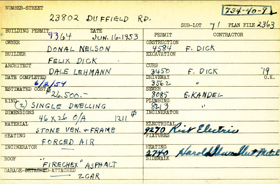 23802 Duffield Road Shaker Heights, OH 44122 PARCEL ID: 734-40-009 Building Permit Date: 06-16-1953 Plan File Number: 1679 scanned, 2363 Microfilm Roll: Roll026, Roll#34 Neighborhood: Mercer Owner: Nelson, Donal Builder: Dick, Felix Architect: Lehmann, Dale Estimated Cost: 26500 Date Completed: 06-02-1954 Kind: Single, Single Residence or Dwelling (2) Material: Stone Veneer and Frame Heating: Forced Air Roof: Asphalt Garage: attached 2 car |