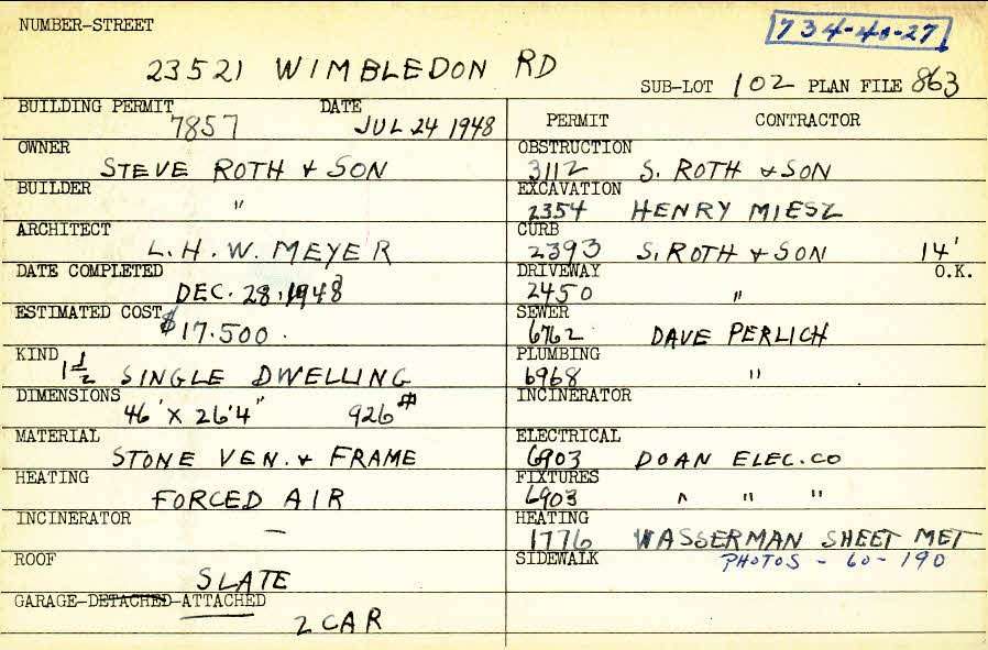 23521 Wimbledon Road Shaker Heights, OH 44122 PARCEL ID: 734-40-027 Building Permit Date: 07-24-1948 Plan File Number: 863 scanned, 1442 scanned, 4206 Microfilm Roll: Roll011, Roll016, Roll#61 Neighborhood: Mercer Owner: Steve Roth and Son Builder: Steve Roth and Son Architect: Meyer, L. H. W. Estimated Cost: 17500 Date Completed: 12-28-1948 Kind: Single, Single Residence or Dwelling Material: Stone Veneer and Frame Heating: Forced Air Roof: Slate Garage: attached 2 car |