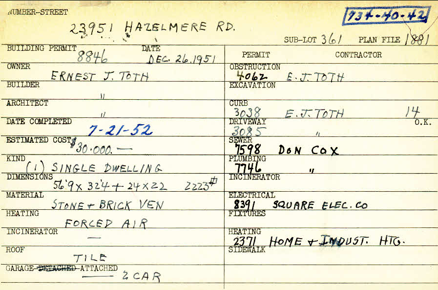 23951 Hazelmere Road Shaker Heights, OH 44122 PARCEL ID: 734-40-042 Building Permit Date: 12-26-1951 Plan File Number: 1881 scanned, 7303 Microfilm Roll: Roll028, Roll#92 Neighborhood: Mercer Owner: Toth, Ernest J. Builder: Toth, Ernest J. Architect: Toth, Ernest J. Estimated Cost: 30000 Date Completed: 07-21-1952 Kind: Single, Single Residence or Dwelling Material: Stone and Brick Veneer Heating: Forced Air Roof: Tile Garage: attached 2 car |