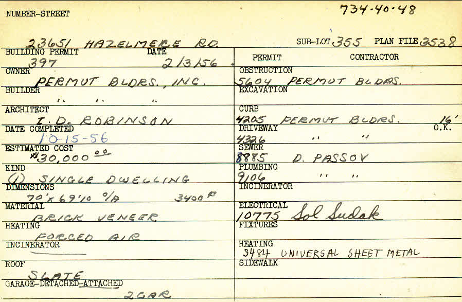 23651 Hazelmere Road Shaker Heights, OH 44122 PARCEL ID: 734-40-048 Building Permit Date: 02-03-1956 Plan File Number: 3538 Microfilm Roll: Roll#52 Neighborhood: Mercer Owner: Permut Builders Inc. Builder: Permut Builders Inc. Architect: Robinson, I. D. Estimated Cost: 30000 Date Completed: 10-15-1956 Kind: Single, Single Residence or Dwelling Material: Brick Veneer Heating: Forced Air Roof: Slate Garage: attached 2 car |